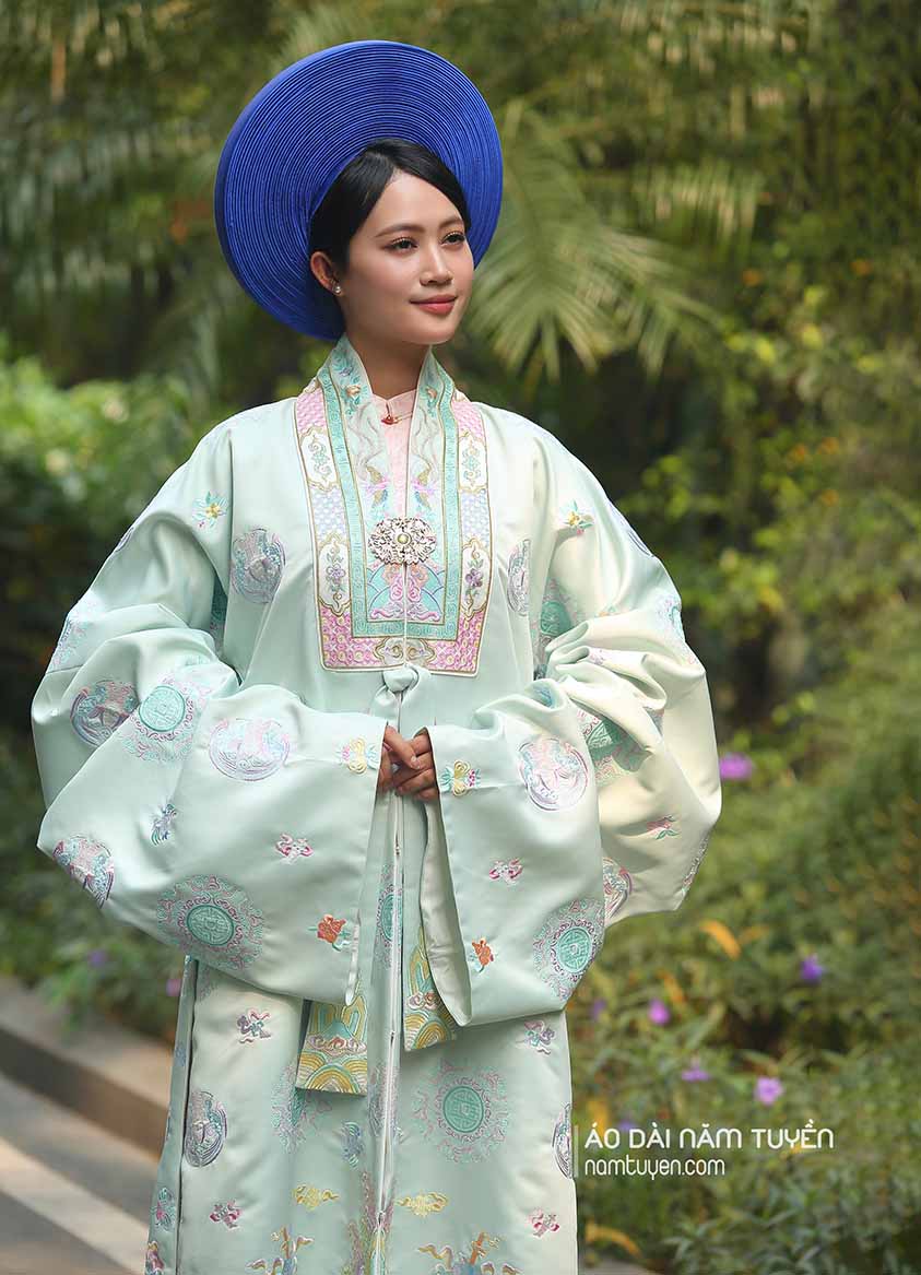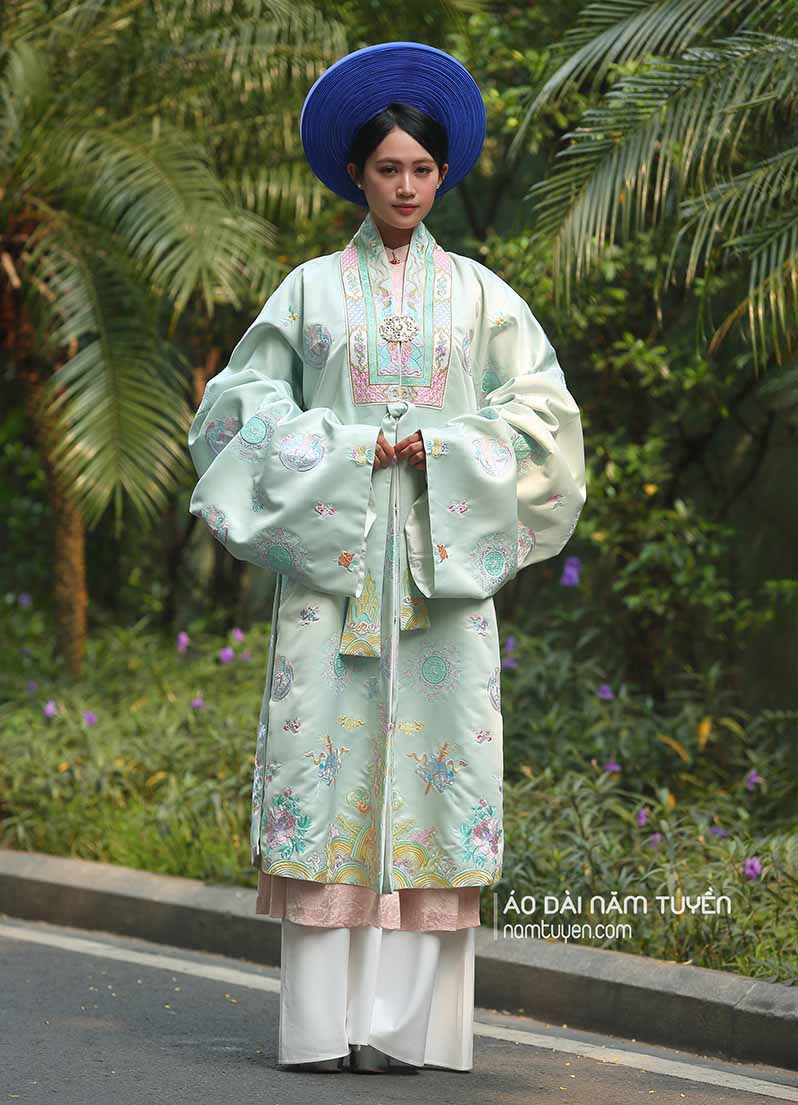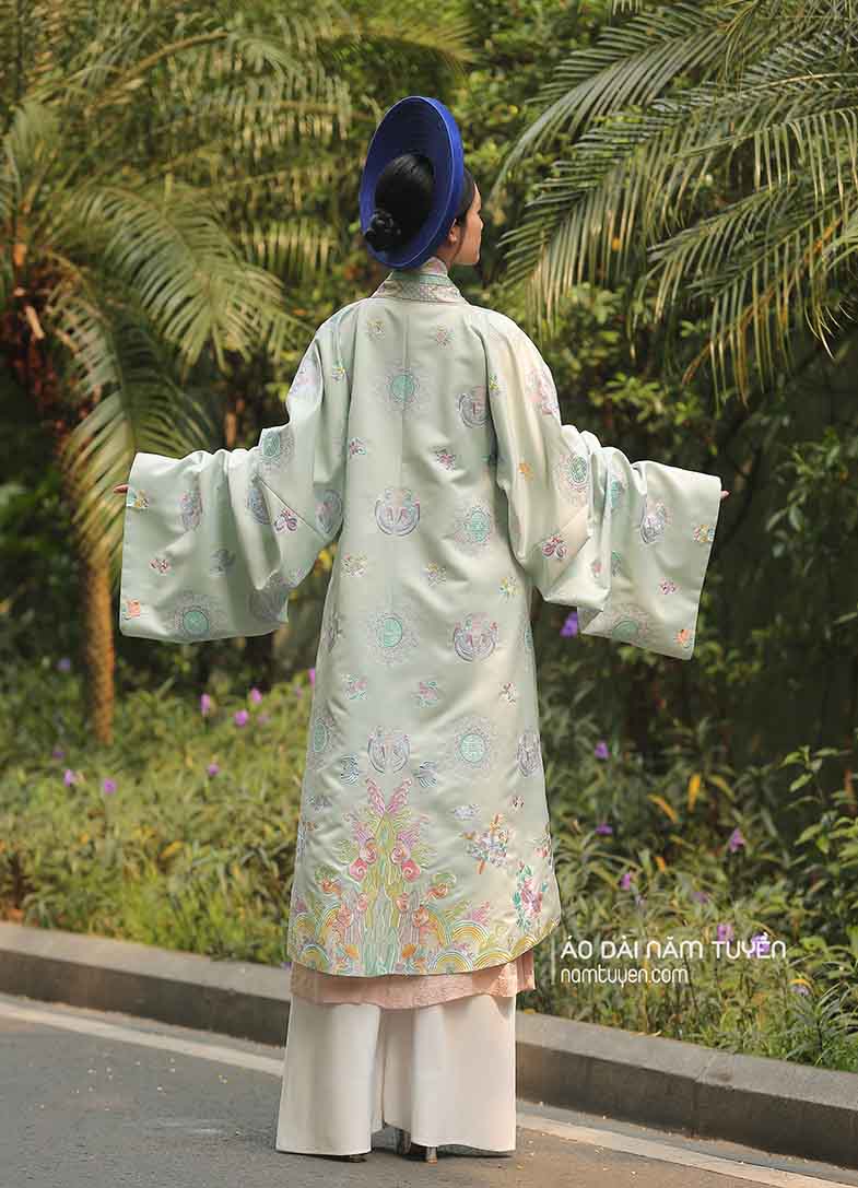 • Vạt áo dài quá gối, phom đứng trang nghiêm.