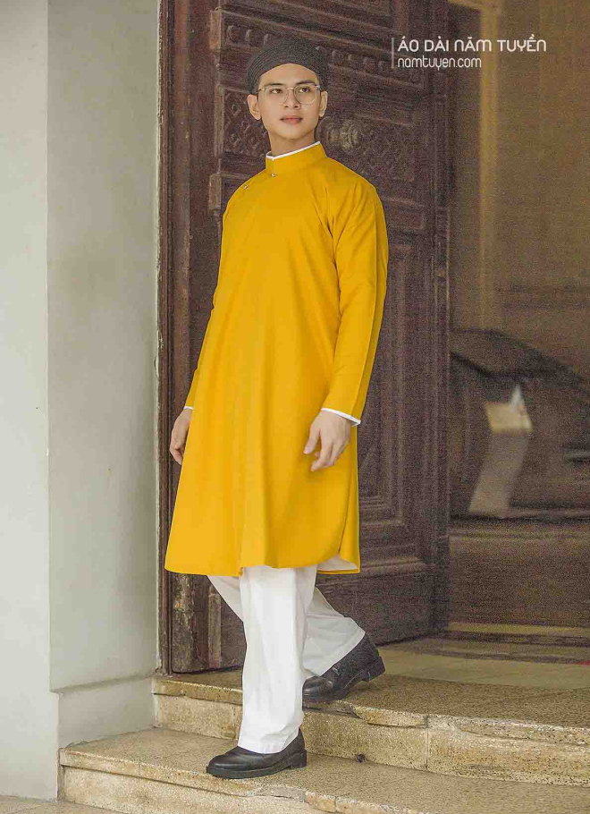Áo dài nam truyền thống màu vàng mang ý nghĩa thịnh vượng, rất được ưa chuộng trong lễ hội, biểu diễn, chụp ảnh. Chất liệu nhẹ, thoáng, tôn form người mặc.