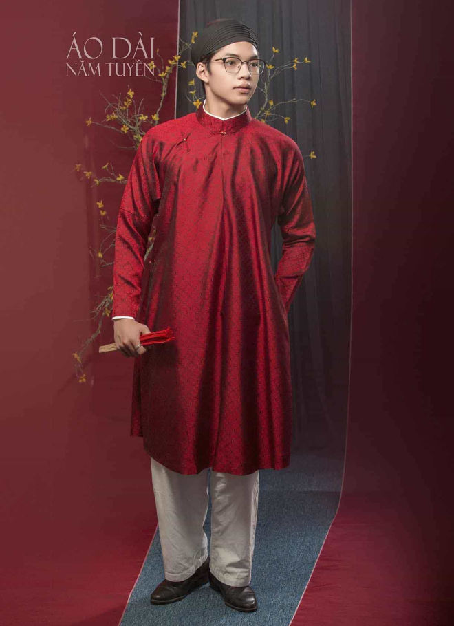 Áo dài truyền thống ngũ thân nam tơ tằm đỏ đô